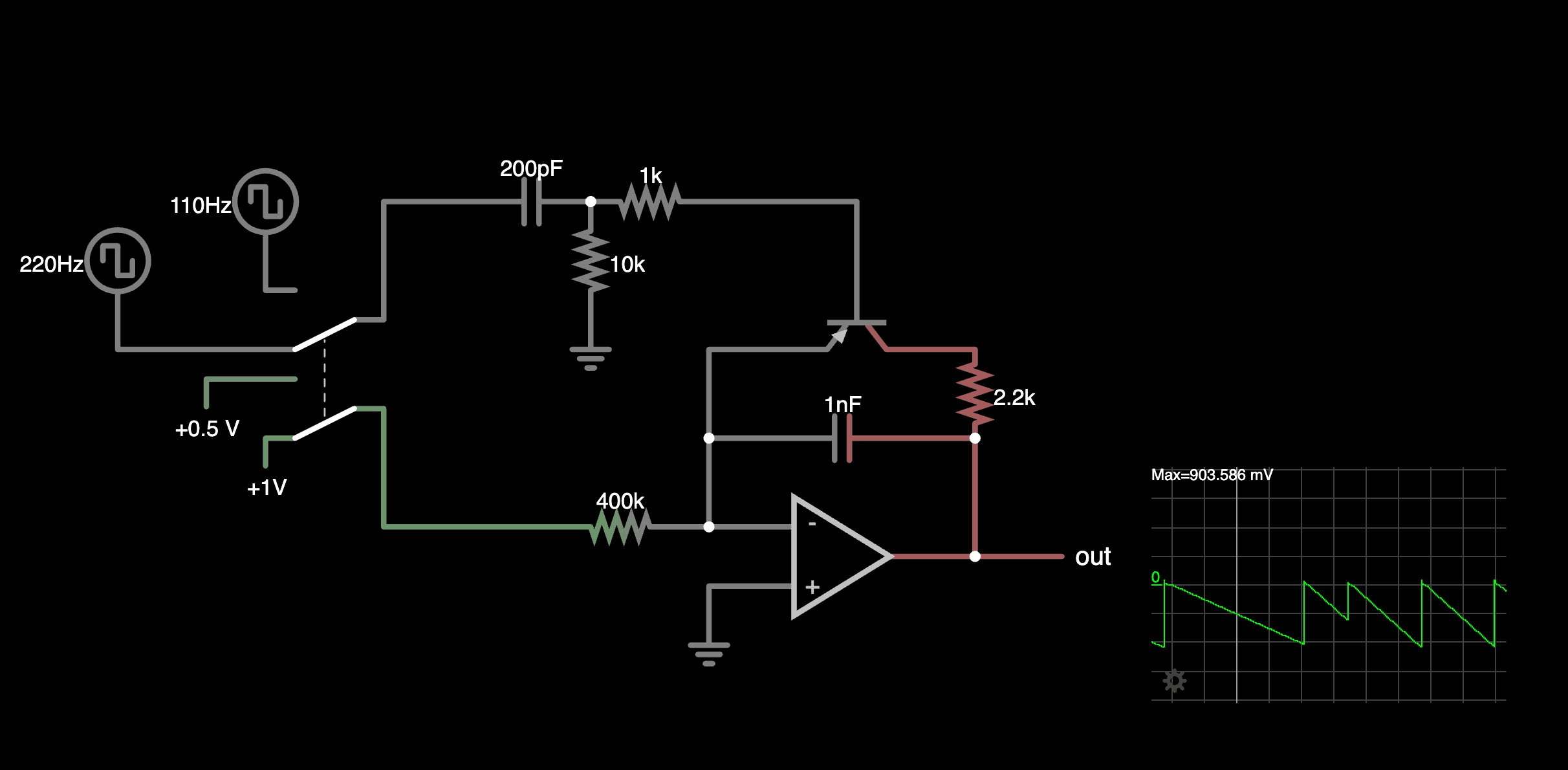 In the previous article we saw how to create a repeating sawtooth wave by combining our clock signal with the ramp generator. However, there's still one problem with that circuit: when we increase the frequency of the clock signal the amplitude of the sawtooth will decrease. The reason for this is that the ramp rate of our circuit is constant and as the frequency of the clock increases there isn't as much time for the fixed ramp to reach the same voltage each cycle. This can be seen in this example where you can vary the slider for the clock frequency and see the affect on the sawtooth amplitude.